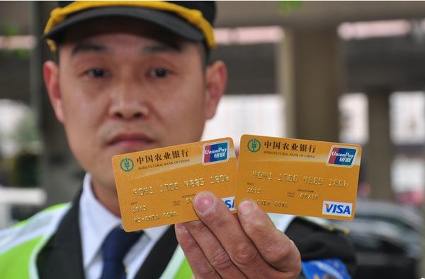 2015年4月21日,河南郑州,近日不断有市民、巡防队员、环卫工在街头捡到附有密码的农业银行信用卡。两张中国农业银行信用卡卡号一模一样。