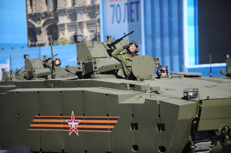 5月7日,在俄罗斯首都莫斯科,一辆“库尔干人-25”步兵战车在彩排中行进。新华社记者 戴天放 摄