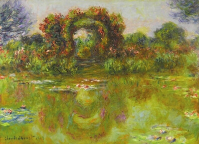 此幅印象派巨作《睡莲池与玫瑰》是莫奈艺术生涯中最重要的作品之一,画于1913年。莫奈精妙地描绘了一座玫瑰花拱廊立于平静如镜的池水上,池中荡漾着朵朵睡莲,静逸而娇媚。莫奈从同一角度以玫瑰花拱廊画了三幅油画,其中一幅现藏于美国阿利桑那州凤凰城美术馆,另一幅被私人收藏,本作是三幅中尺幅最大的,曾被著名艺商及鉴赏家杜杭·胡埃收藏。