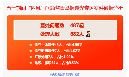五一前后,中央纪委监察部网站再次连续4周通报487起违反中央八项规定精神案件,点名道姓通报曝光682人。透过这些查处的案件,我们看看落实中央八项规定精神有哪些新进展、新成效?哪些“四风”顽疾树倒根在?下一步严纠“四风”工作将有哪些新举措、新趋势?