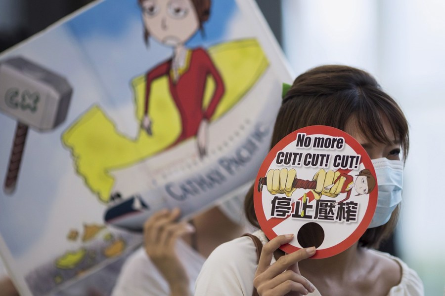 约有1000名国泰航空的空中服务员在香港机场离境大厅游行,呼喊“尊重工会、尊重协议”、“乱改守则当秘笈”、“连番欺压、忍无可忍”等中英文口号,并即时起在机场接机大堂展开两晚通宵马拉松式静坐。