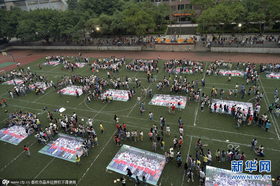 2015年6月8日,重庆市杨家坪中学,千余名2015年高考毕业生,在结束最后科目的考试后,汇聚在操场上摆放班级毕业合影照,以此来结束自己的中学时代。