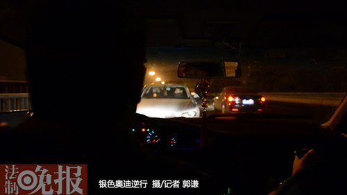 今天凌晨1时30分许,一男子驾驶奥迪轿车在南二环主路右安门桥上逆向行驶时,遭遇记者车辆,他自称酒后驾车,要求让开路面被拒。记者报警后,西城交通支队樱桃园大队民警将男子带走调查。经检测,该男子属于酒后驾车,被处以吊销驾照6个月、记12分、罚款1800元的处罚。