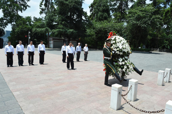 新华网北京6月16日电 据新华社客户端报道,蓝天白云,青松翠柏。习近平总书记16日离京来到贵州遵义考察,一下飞机就直奔红军山烈士陵园,向红军烈士纪念碑敬献花篮。纪念碑四周的浮雕展现了当年红军浴血奋战的场景。在“突破乌江天险”浮雕前,总书记驻足感叹:“当时要是过不去就危险了……”碑上“红军烈士永垂不朽”8个字是邓小平同志题写的,他伫立凝望,听取介绍。这是党的十八大后习近平总书记第一次来黔考察。