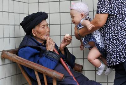 7月15日,四川最长寿老人付素清在家中逗玄孙女。19日,老人将满118岁。