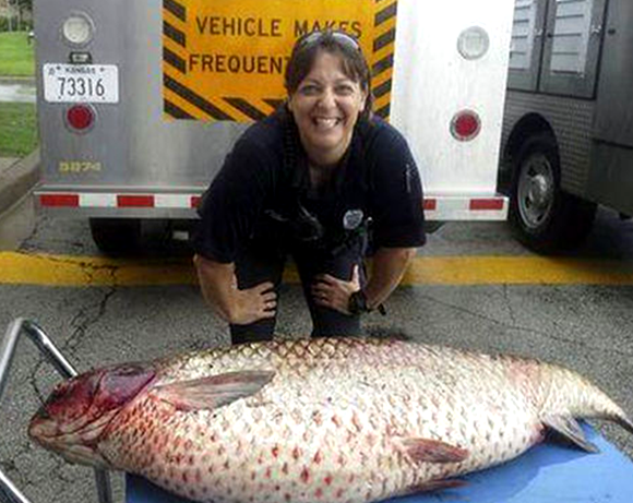 2015年7月18日,近日,美国堪萨斯州奥拉西的城市动物管制官杰米•施密特(Jamie Schmidt)从排水沟里捞起一条重达60磅(27千克)的巨型鲤鱼。该巨型鲤鱼是由一名正在散步的男子偶然发现的,随后他立即告诉了警察。