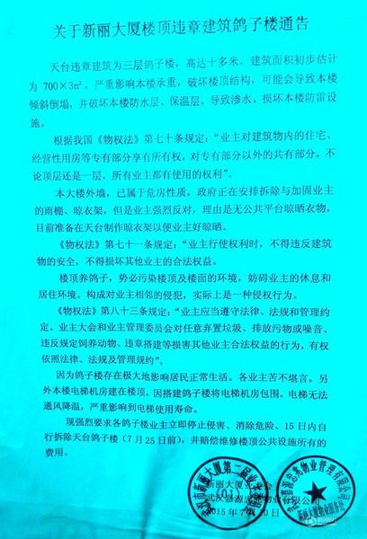 记者在新丽大厦门口看到,大厦业委会和物业公司张贴了一则有关楼顶违建鸽舍的通告。通告称:楼顶天台的三层鸽舍系违法建筑,高10余米,建筑面积初步估计达2100平方米,严重影响大楼承重和楼顶结构,破坏了防水层、保温层并导致渗水,损坏了大楼防雷设施。业委会和物业公司一致要求,鸽舍业主立即停止侵害,消除危险,15日内自行拆除鸽舍,并赔偿维修楼顶公共设施的全部费用。