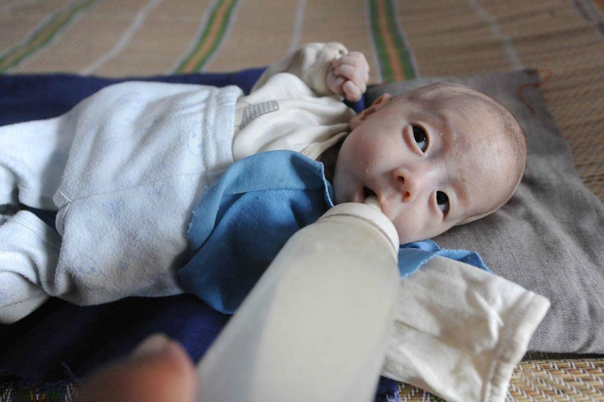 从外面回来的爷爷看到孩子哭闹,从桌子上浑浊不堪的塑料瓶里挖了两杯勺奶粉给孩子冲着喝,当“天使爱婴行动”志愿者问及为什么孩子的食量如此小时,憨厚的爷爷顿时两眼泪珠,他指着孩子隆起的肚子说:“孩子不能排便,大便小便都从小鸡鸡排出,吃的多了排不出他更难受。现在每天只给孩子吃两次奶,每次两杯勺,孩子因为饥饿一直啼哭,也不能让他多吃,活着我们全家就有希望。”听到这番话,现场所有人泣不成声。