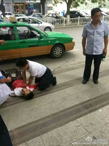 延安男子捅伤保安 白衣染红 嫌疑人强行将其情人拉走被保安阻止