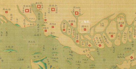 图中上方为黄色陆地,下方为绿色海洋,上西下东,以方块、圆圈、菱形等不同符号标注行政区划分。把头右倾45度看图,是不是立刻就对那时的「上海县」地形熟悉了一点?完整的「口隘全图」里记录了沿岸山河、港口、暗礁等情况,重要之处写有行船须知、海防守则等细节。这也体现了中国古地图多文字说明的特点。