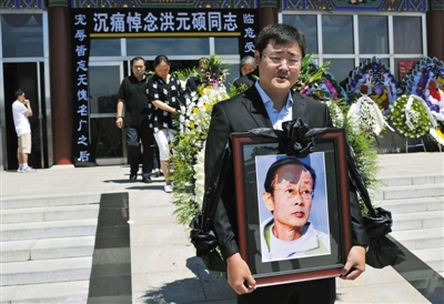 送走最后一批球迷,洪元硕的儿子手捧父亲遗像离开告别厅。本版图片/新京报记者 吴江 摄