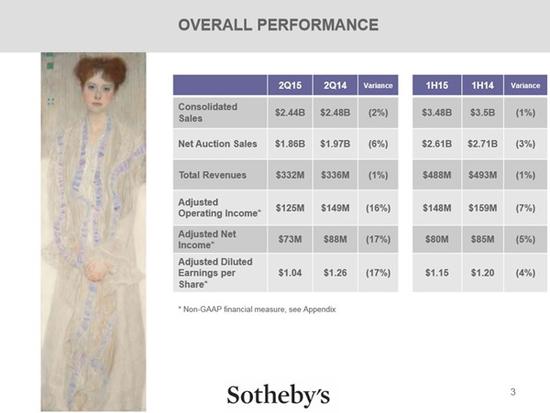 在6月30日为终点的第二个财政季度中,苏富比的报告显示该季度的净收益为6760万美元,每股约96美分,与2014年同期的净收益7760万美元,每股1.12美元相比明显下滑。调整后的一次性收益及成本是每股1.04美元,尽管如此,还是没有达到扎克投资研究所(Zacks Investment Research)五位分析师作出的每股1.25美元的预期。