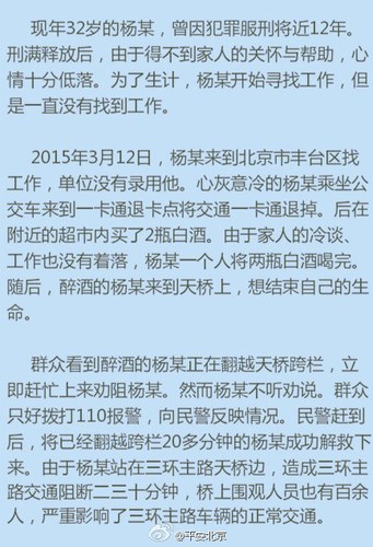 中新网8月21日电 据北京市公安局官方微博“平安北京”消息,北京一男子杨某酒后为发泄不满情绪欲跳桥,造成大量群众围观,影响北京市三环道路通行,一度造成交通阻断近三十分钟,致使公共场所秩序严重混乱。近日,北京市丰台区人民检察院以寻衅滋事罪对杨某提起公诉。
