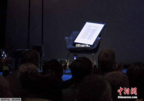 当地时间2015年9月5日,挪威莫尔德,美国国家安全局前雇员斯诺登被授予“比昂松言论自由奖”,大屏幕展示他的照片,一张空椅子代表他领奖。