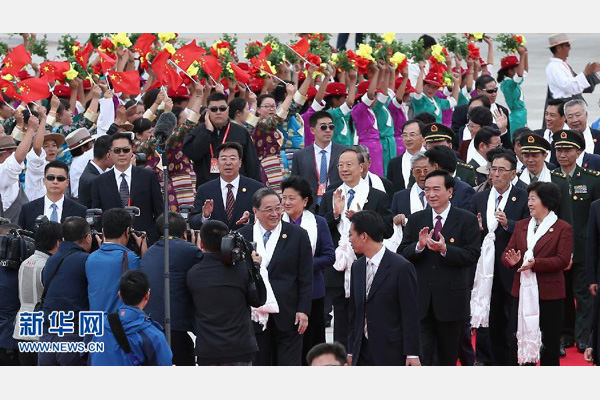 担任中央代表团副团长的中共中央政治局委员、国务院副总理刘延东,中共中央政治局委员、中央统战部部长孙春兰,中共中央书记处书记、全国政协副主席杜青林,全国人大常委会副委员长向巴平措,全国政协副主席帕巴拉·格列朗杰,十届全国人大常委会副委员长热地,中央军委委员、总政治部主任张阳一同走下舷梯。中央代表团成员同期抵达。