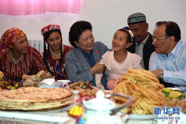 9月26日,中共中央政治局委员、国务院副总理、中央代表团副团长刘延东率中央代表团分团到和田地区看望慰问各族干部群众。这是刘延东在和田市吉亚乡喀勒塔吐格曼村与维吾尔族群众在一起。新华社记者张领摄