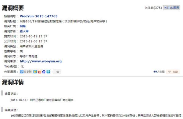 10月19日下午消息,乌云漏洞报告平台今日宣布接到一起惊人的数据泄密报告,网易的用户数据库疑似泄露,影响到网易163/126邮箱过亿数据,泄露信息包括用户名、MD5密码、密码密保信息、登陆ip以及用户生日等,其中密码密保均为MD5存储,解开后测试大部分邮箱依旧还可登陆。