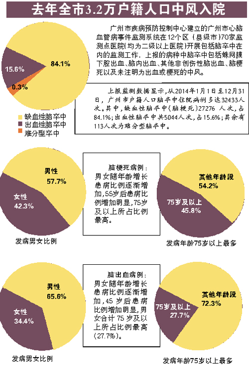 今天是世界卒中日。广州市疾病预防控制中心心脑血管病事件监测系统显示,2014年全年,市内因脑卒中住院病例的户籍人口多达3.2万人次,其中脑梗死患病比例在55岁后增加明显,脑内出血病例在45岁后增加明显。虽然脑卒中往往被认为是“老年病”,但市疾控提醒,预防脑卒中应从幼年开始!