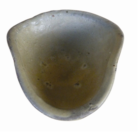 图2是唐代四川各窑口均有生产的锅盔碟灯盏。作为四川人普遍喜爱的食物——锅盔,从古到今,都有圆形和椭圆形两种。所以,锅盔碟灯盏也有圆形和椭圆形两种。根据笔者在古玩市场所见,可以肯定,圆形锅盔碟灯盏存世居多,椭圆形锅盔碟灯盏极为少见。古玩市场上,一般藏友遇见此类器物,常常不仔细研究、磋磨,往往误认为是烧夹扁了的次品。其实不然,椭圆形锅盔碟灯盏在实际使用中,更方便把盏中暂时不用的剩油倾倒回油罐,使燃油减少浪费。其制坯工艺则是在圆形锅盔碟素坯基础上,用双手均匀使劲将其捏成椭圆形的。