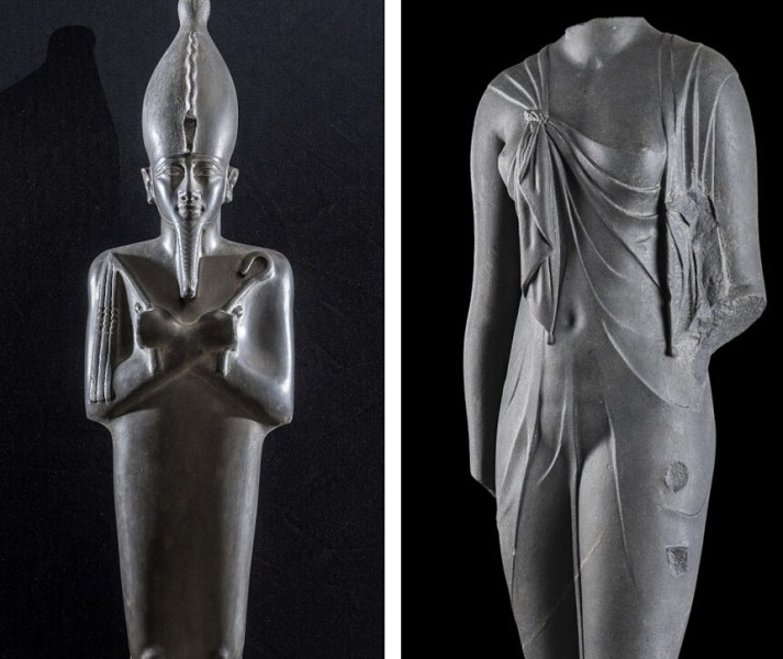 这两件真人大小的塑像也将在伦敦展出,它们可追溯到公元前7世纪。其中左图是地狱判官(埃及神话人物名),右图则是法老王普托雷麦兹(Ptolemaic)的王后阿尔西诺伊二世(Arsinoe II)的塑像。(网页截图)