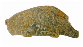2002年长安县茅坡西汉中期墓葬出土有1件豭豚玉佩(图2),佩长11.5、宽4.4厘米,片雕成一伏卧野猪的形象,短尾回卷形成一孔,阴线勾勒出四肢及细部特征,两面纹饰相同。类似造型的玉器在陕西西安北郊卢家口亦有出土。《史记·仲尼弟子列传》中载:“子路性鄙,好勇力,志抗直,冠雄鷄,佩豭豚,陵暴孔子。”南朝斐驷集解:“冠以雄鷄,佩以豭豚,二物皆勇,故冠带之。”佩戴这种豭豚玉佩应该是寓意勇猛之意。