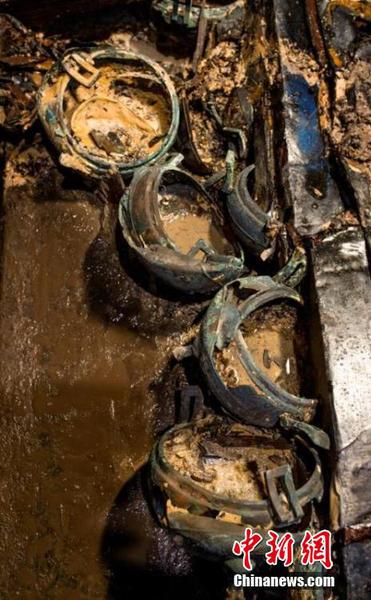 12月7日,考古工作者在南昌西汉大墓主椁室南侧清理出一件精美的玉环。 郭晶 摄