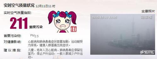 2015年12月11日11点上海空气质量播报:PM2.5浓度169.0,空气质量指数211,五级重度污染。小朋友、老人及心脏病、肺病患者应停留在室内,停止户外运动。一般人群减少户外运动
