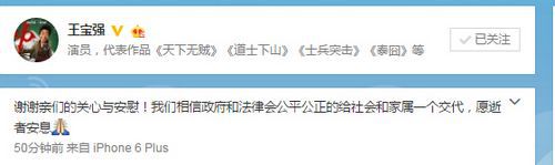 中新网12月16日电 12月14日,就亲人遭遇车祸一事,演员王宝强在微博发表声明。他证实,自己的弟妹在车祸中被撞身亡,肇事者共有三人,其中一人已经投案,另外两人举家逃逸。同时,王宝强也对13日自己在微博上情绪失控“爆粗口”致歉。今日,王宝强再次更新微博,留言回应众人关心,称“谢谢亲们的关心与安慰!我们相信政府和法律会公平公正的给社会和家属一个交代,愿逝者安息”。