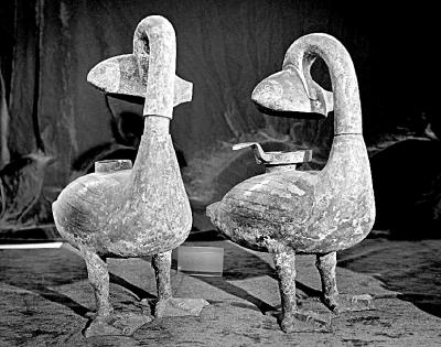 海昏侯墓考古发掘现场及发掘的“铜火锅”、雁鱼灯、“蒸馏器” 新华社发