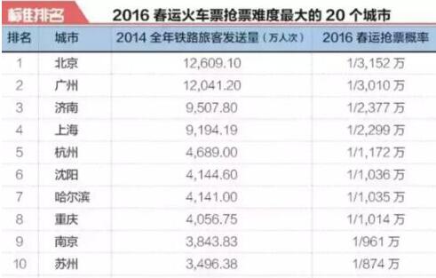 据了解,上榜前十的城市分别为北京、广州、济南、上海、杭州、沈阳、哈尔滨、重庆、南京、苏州。就济南而言,2014年有9507.80万人次的旅客发送量,2016年春运火车票抢票概率为1/2377万。