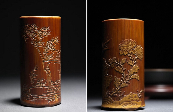 清乾隆 周芷岩制“竹石图”竹雕笔筒(左)与清雍正潘西凤制“菊石图”竹雕笔筒(右)