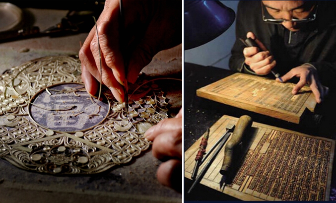 成都银花丝制作技艺(左)与雕版印刷技艺(右)