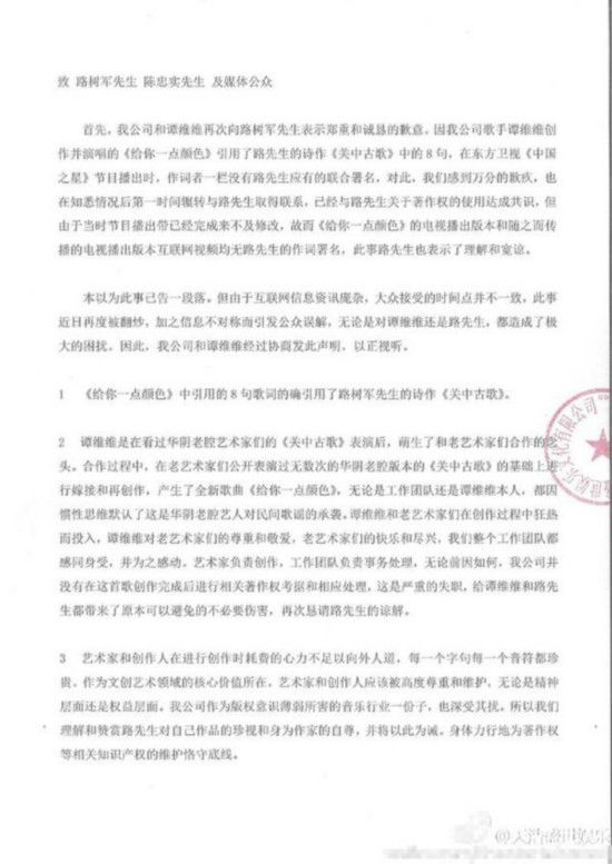 谭维维《给你一点颜色》陷抄袭 向两前辈公开致歉