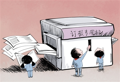 近日,江西泰和县几个村级小学的家长向媒体反映,中心小学学生领到的《小学生学习报》有试题、有阅读材料,每期4个彩版。而几所村小700余名学生拿到手的却是报纸复印件。(12月16日《江西日报》)漫画/勾犇