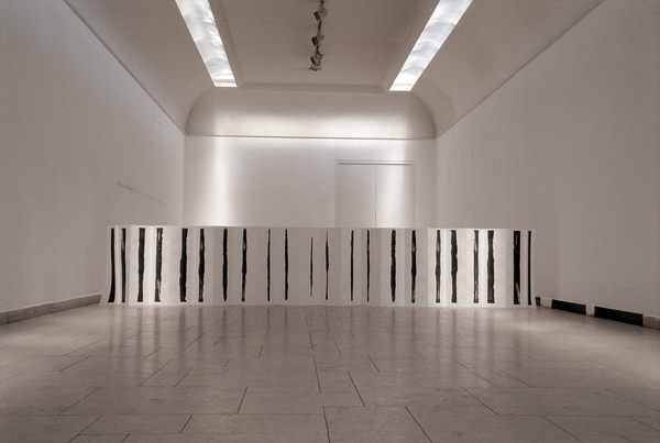 在经历一段跳跃的过程之后,1992—1993年,我的作品真的开始简约起来,画面已经摆脱具体的中国因素的图示,只留下黑色的线条和象征性的长型,最后演绎成为装置作品。看起来仍旧很东方,但难以寻找到东方的图像了。极少主义艺术是一种生活方式,它与东方禅宗所追求的意境不谋而合。当我以极少主义的形式来表达禅宗的意境时,黑色的背后就隐含着某种意境。这也是我的装置作品占据一个欧洲传统建筑的空间时,体现出来的不仅是空间的构成,而是具有很强的象征意义。因此,1993年在柏林展出的装置作品《时间》系列使我的铜版画又产生一个重大变化。它使我的版画从一个平面走向空间,走向时间。十几条用铜版印制、形同书法的8米长的黑线分别悬挂在建筑的立柱上,意图寻找建筑的精神内涵和建构新的文化空间。装置《书》将一条完整的铜版按照规定时间进行腐蚀,将每一阶段的成果印制和记录下来,将“时间”的创造过程展示给观众,这时就发现每一个阶段呈现给我们的都是一个偶然、一个过渡,也是一个结果,停留是我的决定,而效果却是硝酸偶然的创造。再回到国内,回到美院,对抽象主义作品的创作和理解更加深刻,也更加自由,比如《无题》,抽象形态取代了带有具象因素的画面,技术手法也更完美,开始用最少的材料来传达最丰富的意义。
