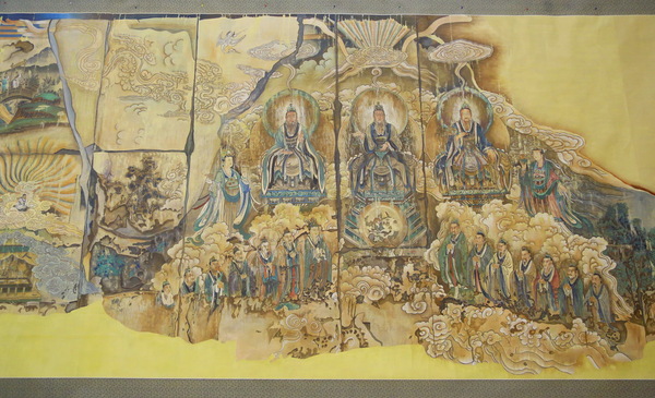 来汉参加开幕式的刘庸之介绍,他临摹的一共是四大幅作品和一幅小作品,其中三清殿的《朝元图》有白描和彩色稿两幅,均为90多米长,4.66米宽,另外两幅大作品是纯阳殿的《纯阳帝君神游显化图》(长61.22米、宽4.2米)、重阳殿的《七真人画传》(长61.25米、宽3.92米),还有一幅无极殿的《四大天王》。