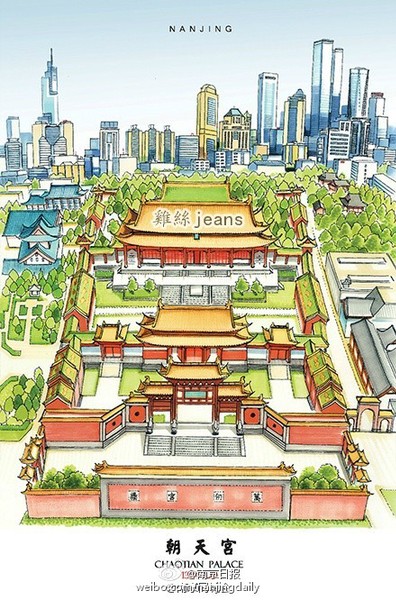 近日,一组南京地标建筑手绘图在微博热传,别出心裁的绘画角度让不少南京网友评价“绝对摆,超小清新”。在这9张各具特色的作品中,既有表现今昔对比的明故宫,也有刚揭开神秘面纱的大报恩寺遗址公园,还有俯视角度下波光粼粼的秦淮河……发布这些手绘画的是微博博主“雞絲jeans”,他是土生土长的南京小伙子,目前最大的心愿是出一本手绘南京的书,用自己的一双手绘出南京的美。