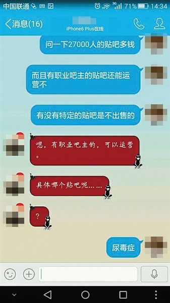 一要求匿名的吧友提供了数张对话截图显示,他曾向某代理问价“尿毒症吧”的吧主价格,对方回应称有职业吧主的贴吧也可以运营,但此类病种吧,需要由申请人给出对这个贴吧的预算报价,由他们来上报,最后对该贴吧定出最低价,并进行公开竞价,“哪家公司出价高,哪边获得。”