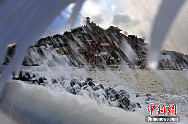 寒潮发威 山东蓬莱海滨出现冰挂奇观
