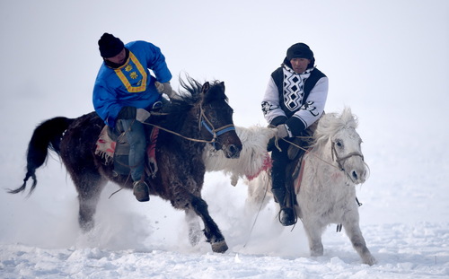 1月26日,位于新疆天山天池畔的阜康市最低气温接近零下三十摄氏度。在阜康市广袤的雪原上,当地上百名农牧民为庆祝第十三届全国冬季运动会,表演了独具特色的雪地叼羊、姑娘追等民族体育活动,吸引了大量游客观赏。新华社记者任军川摄