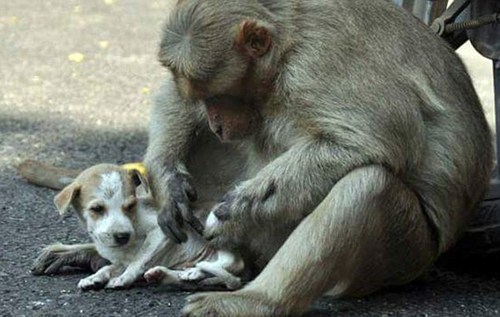 关键词:猴子收养流浪小狗 印度猴子 收养流浪小狗
