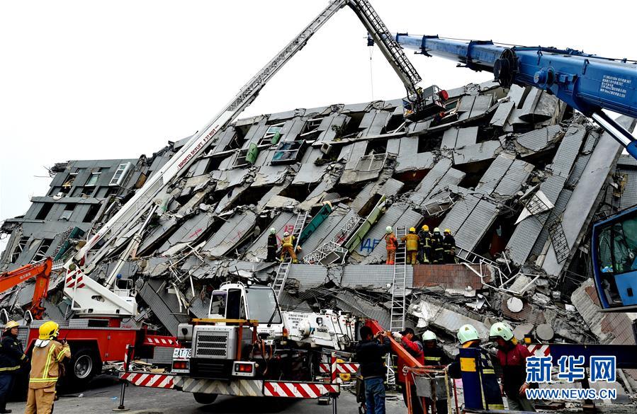 2月6日,施救人员在位于台南永大二路附近倒塌的一幢建筑上展开施救。当日凌晨,台湾南部发生强烈地震,造成严重灾情,据统计,地震已造成5人死亡,导致房屋全倒8栋,半倒5栋,全部位于台南。 新华社记者张国俊 摄