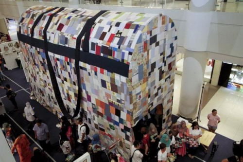 据报道,这个世界最大的手提包长7.62米、宽3米、高5.6米,由1492名参与者使用2984块穿着过的衣服布料,耗时6个月制作完成。