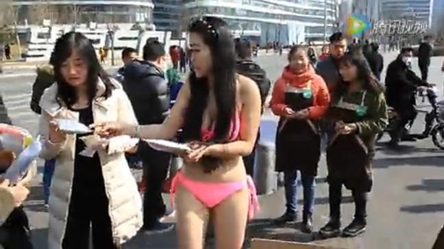 望京街头比基尼女郎街头送泳裤 响应“去库存”