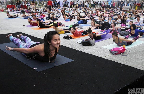 2016年3月5日,中国香港,美女在街头练瑜伽,大秀好身材。