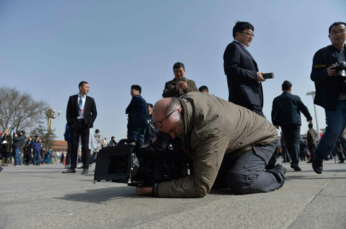 大批外国记者在寒风中等候,人民大会堂前的记者队伍已经堪比“春运”买票,一名外国记者脖子上汉字“成功”的纹身,可谓精诚所至。人群中一名外国使节做着轮椅排队采访的画面更是感动了不少媒体记者。一名上了年纪的外国记者在人民大会堂前弓身取景。记者在人民大会堂内领到相关文件后抓紧阅读。中外记者在人民大会堂内领到相关文件后抓紧阅读。外国记者阅读《政府工作报告》后抓紧时间发稿。