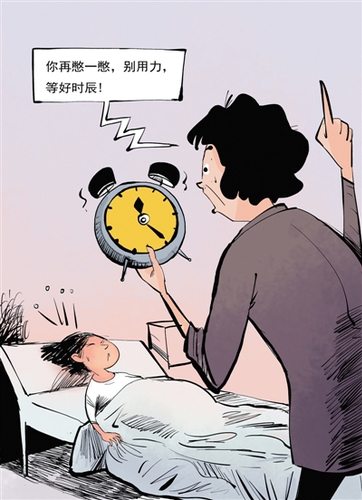 浙江一孕妇临产,宫口已开了七八公分,其母张阿姨却不高兴:“按这个时辰顺产,孩子生辰八字不好”,并嘱咐女儿:“你再憋一憋,别用力,等好时辰”。而此时,胎儿的头发都露出来了。医生:不能延迟!最终孕妇配合用力,顺利生产。(3月6日人民网)漫画/勾犇