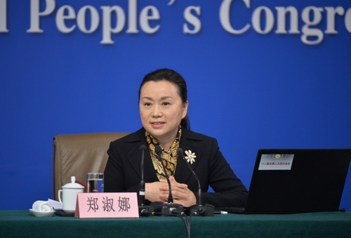 3月10日,十二届全国人大四次会议新闻中心在北京梅地亚中心举行记者会,邀请全国人大内司委副主任委员王胜明、全国人大财经委副主任委员乌日图、全国人大环资委副主任委员袁驷、全国人大常委会法工委副主任郑淑娜就“人大立法工作”的相关问题回答中外记者的提问。这是郑淑娜在回答记者提问。 新华社记者李鑫摄