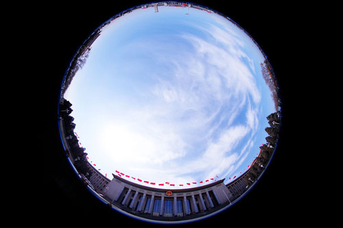 中国网摄影记者用“鱼眼”镜头记录了一组两会会场外的场景。中国网 郑亮摄