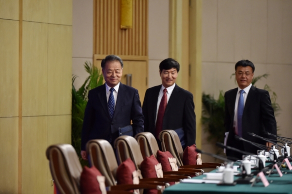 3月14日,十二届全国人大四次会议新闻中心举行记者会,邀请交通运输部部长杨传堂、交通运输部运输服务司司长刘小明、北京交通发展研究中心主任郭继孚就“深化出租汽车改革与发展”的相关问题回答中外记者的提问。这是杨传堂等步入会场。